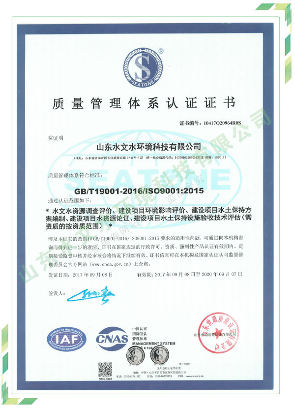 公司擁有水利工程設(shè)計、水土保持、水文水資源調(diào)查評價、水資源論證、建設(shè)項目環(huán)境影響評價、市政公用工程施工總承包、水利水電工程施工總承包、電子與智能化工程專業(yè)承包等資質(zhì),2017年通過質(zhì)量管理體系、環(huán)境管理體系、職業(yè)健康安全管理體系認(rèn)證;2020年被評為國家級高新技術(shù)企業(yè),同年被中國水利企業(yè)協(xié)會推薦為第一批“合同節(jié)水服務(wù)企業(yè)”;2021年被山東省、濟(jì)南市評為 “專精特新”中小企業(yè)。業(yè)務(wù)范圍涉及水利工程設(shè)計;節(jié)水設(shè)計、改造、水平衡測試;山洪災(zāi)害調(diào)查;城市水資源調(diào)查評價;建設(shè)項目水土保持方案編制、監(jiān)測、驗收、水土保持規(guī)劃;水安全保障規(guī)劃、建設(shè)項目水資源論證、規(guī)劃水資源論證;建設(shè)項目環(huán)境影響評價;入河排污口論證;防洪影響評價;市政公用工程施工、水利水電工程施工、電子與智能化工程施工等。